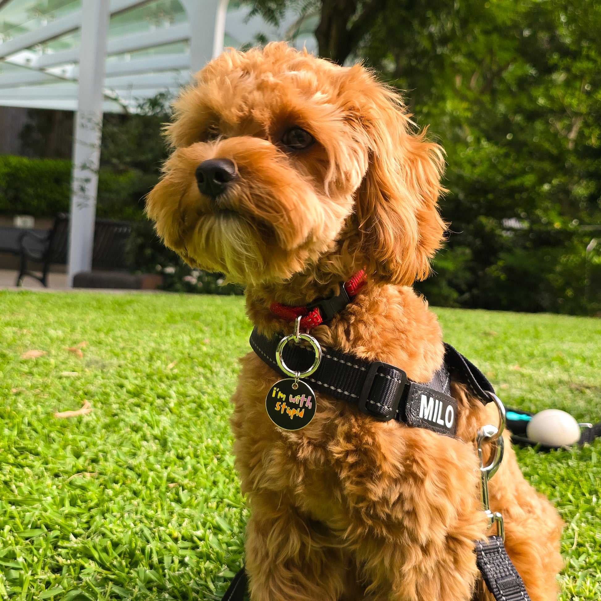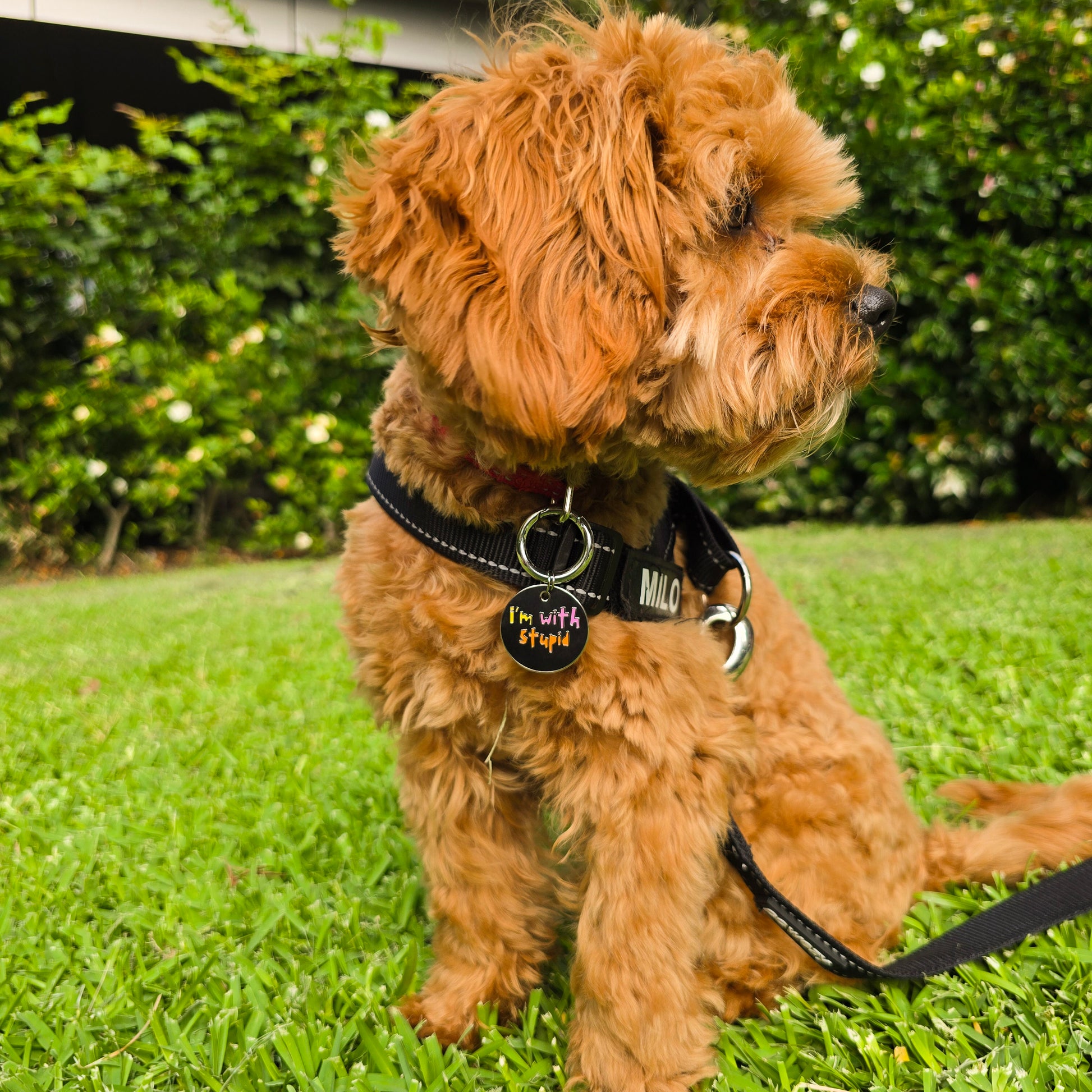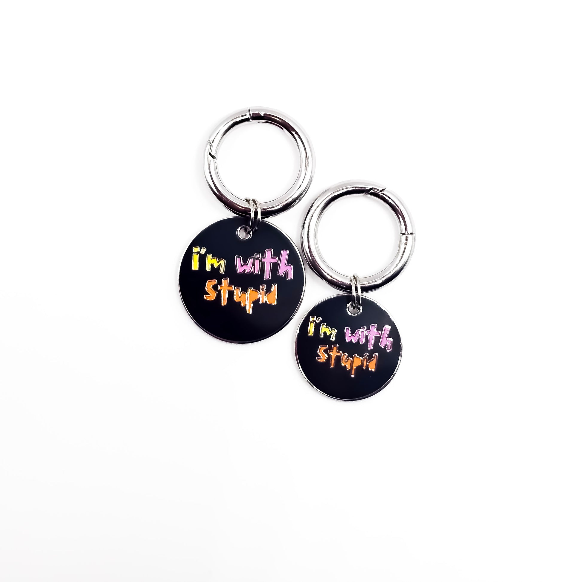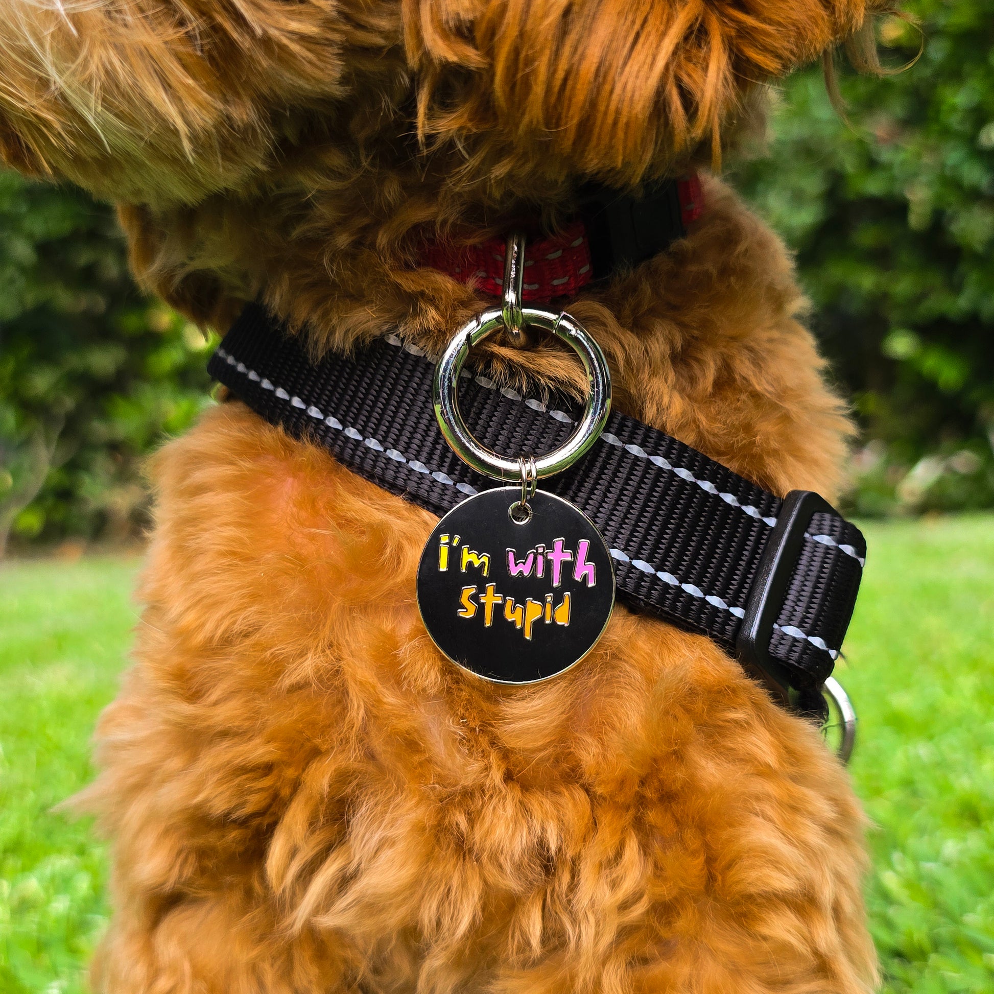 Let your dog strut their hilarious personality with our cheeky "I'm With Stupid" tag. Designed for durability and style, this tag will keep your pup looking sharp (and a little sarcastic)!
